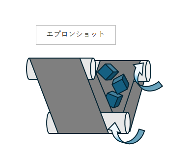エプロン(ベルトコンベア)内部に鋳物を投入し、撹拌しながらショットを投射する方式。
