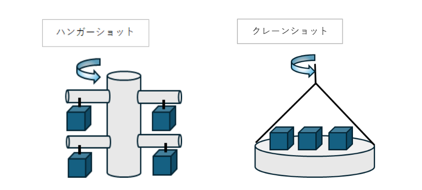 また、大洋産業では使用していませんが似たような方式でハンガーショットという設備も存在します。見た目は洗濯物を干しているような感じで製品をフックに引っかけ、クレーンよりは小物に特化したタイプもあります。